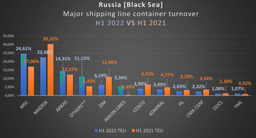 Tổng khối lượng container của Nga trên Biển Đen trong nửa đầu năm 2022 đã giảm 7,7% so với cùng kỳ năm ngoái, trong khi khối lượng vận chuyển hàng hóa giảm 11,1%. Một số hãng tàu toàn cầu đã nhanh chóng giảm hoạt động kể từ tháng 3 năm 2022. Một số công ty vận tải biển toàn cầu (như Maersk) đã quyết định rút khỏi thị trường container của Nga, đình chỉ hoàn toàn việc đặt hàng hoặc hạn chế hoạt động đối với một số loại hàng hóa nhất định.